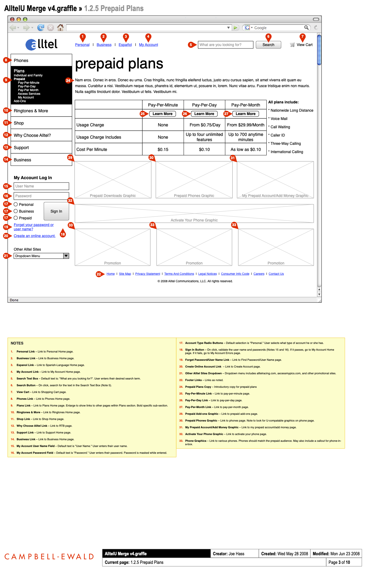 We created wireframes of necessary pages based on the new site map, blending it into the current alltel.com look and feel as well as navigation, while being flexible for future usage.